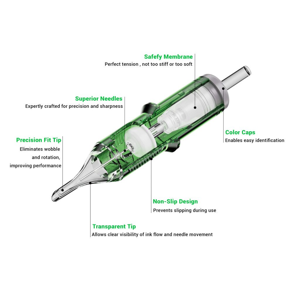 Construidos entorno a un cartucho de máxima calidad de grado médico, con la punta del mismo más corta y fina de lo habitual para un trabajo más veloz y preciso, fabricado en material transparente y con unas agujas de calidad a la altura de las mejores. Estos cartuchos ofrecen menor resistencia a la fricción, con lo que la aguja alcanza una mayor velocidad a un menor voltaje.