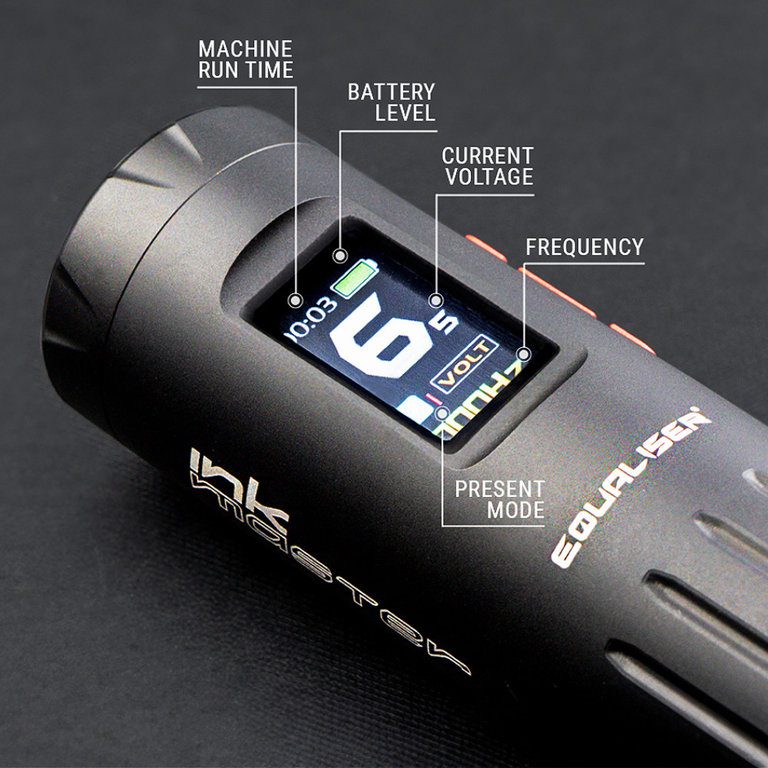 La Ink Master 3.5 presenta una pantalla LED a todo color que muestra toda la información necesaria de un modo fácil de leer: tiempo de uso durante la actual sesión, voltaje en uso, nivel de la batería y modo de uso seleccionado. Se establecen tres modos de uso (M1, M2 y M3) entre los que podrás cambiar con mucha sencillez y en los que encontarás uno ideal para cada situación. Trabajarás de modo fácil y confortable con esta máquina.