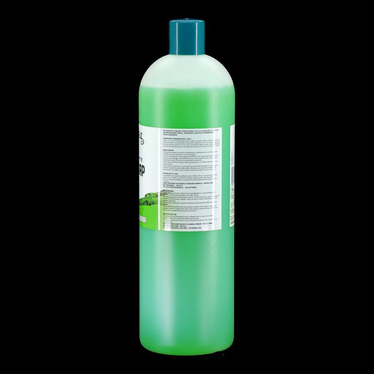 Detergente líquido concentrado para la limpieza de tatuajes, con acción antibactericida. Así mismo, desarrolla acciones hidratantes, calmantes y astringentes y es hipoalergénico y presenta un PH indicado específicamente para su utilización en piel humana. Indicado para utilizarse antes, durante y después de la realización del tatuaje.