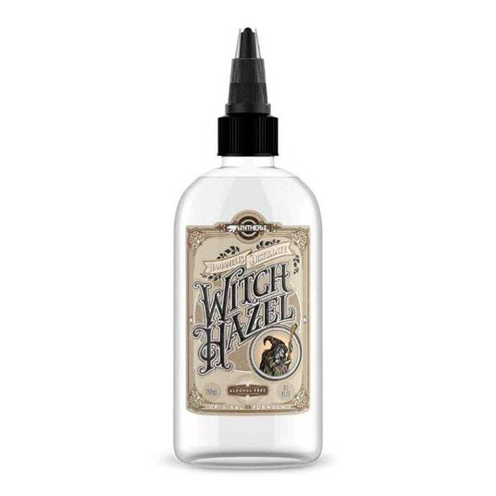 Su principal componente es agua destilada de Hammamelis Virginiana. Es un producto sin alcohol muy apreciado también para suavizar la piel después de tatuar y para promover el sanado de tatuajes recientes. Panthera Witch Hazel se obtiene usando la ancestral fórmula que preserva todas las propiedades de la planta sin la presencia de alcohol. Esto te permite conseguir la máxima acción de las propiedades astringentes, calmantes y acondicionadoras del Witch Hazel en tu piel. En contacto, hará que la piel se contraiga mientras la calma y reduce la rojez y el malestar. El Witch Hazel puede ser diluido con agua destilada y también puede ser usado durante el tatuaje.