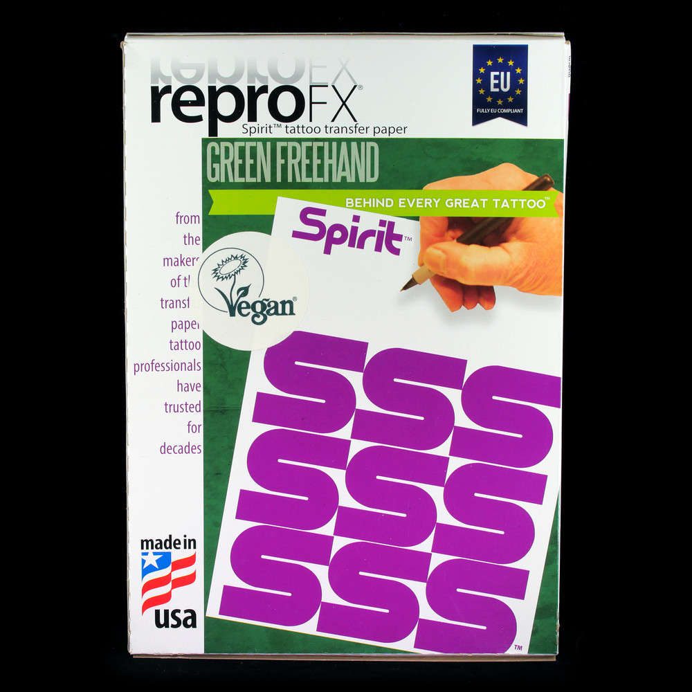 Caja de 100 hojas de papel hectográfico manual Spirit Green Freehand. Papel hectográfico para diseños de tattoo realizados a mano.
